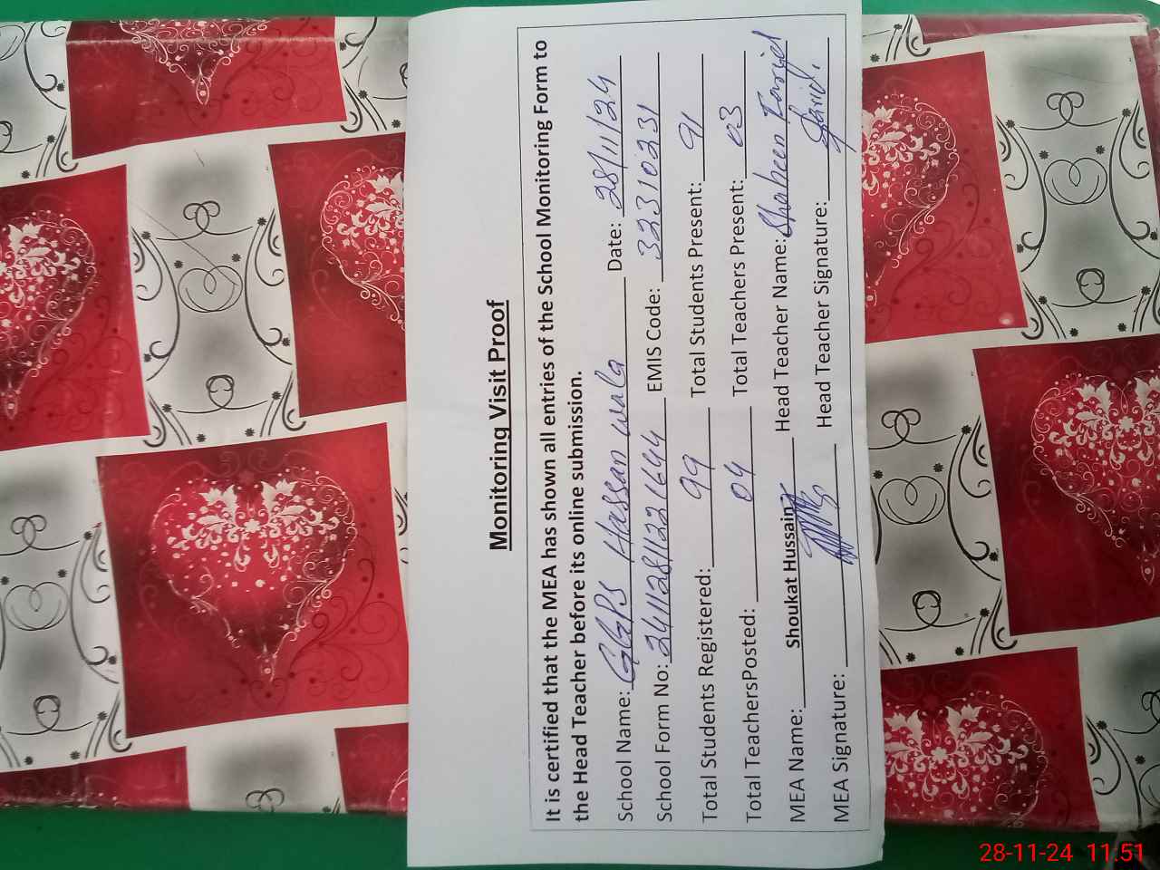 | Attendance Register | Head Teacher | MEA with School | Visit Proof |