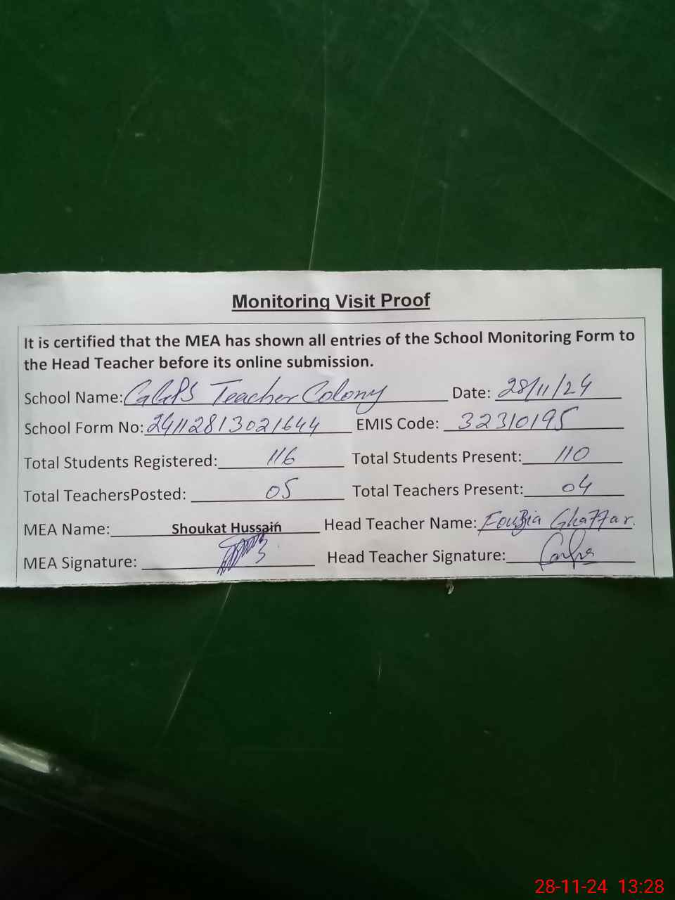 | EMIS Code: 32310195 | Name of School: GGPS TEACHER COLONY | |||
