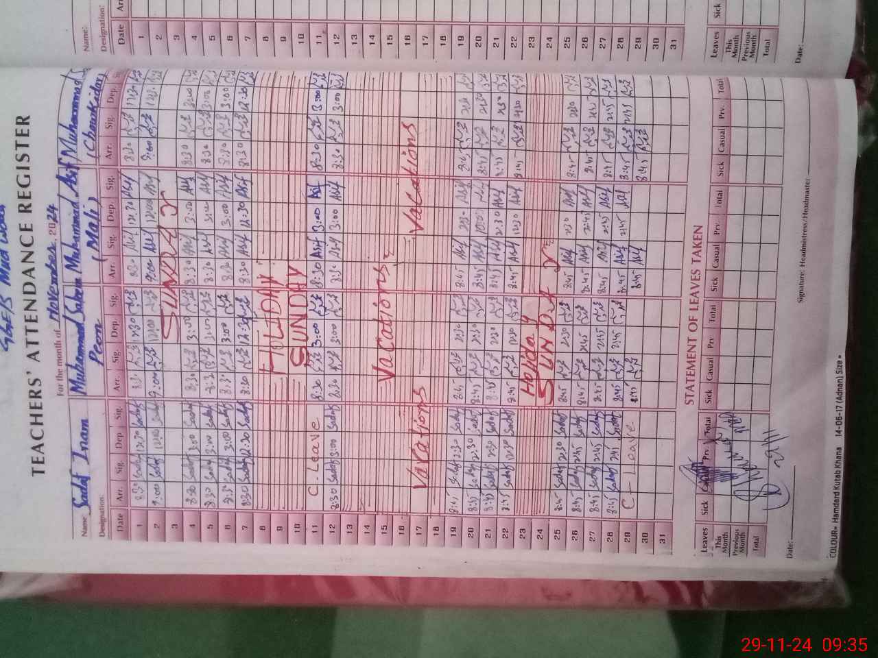 | CNIC | Full Name | Designation | R/C | Absence During Last Calender Month |