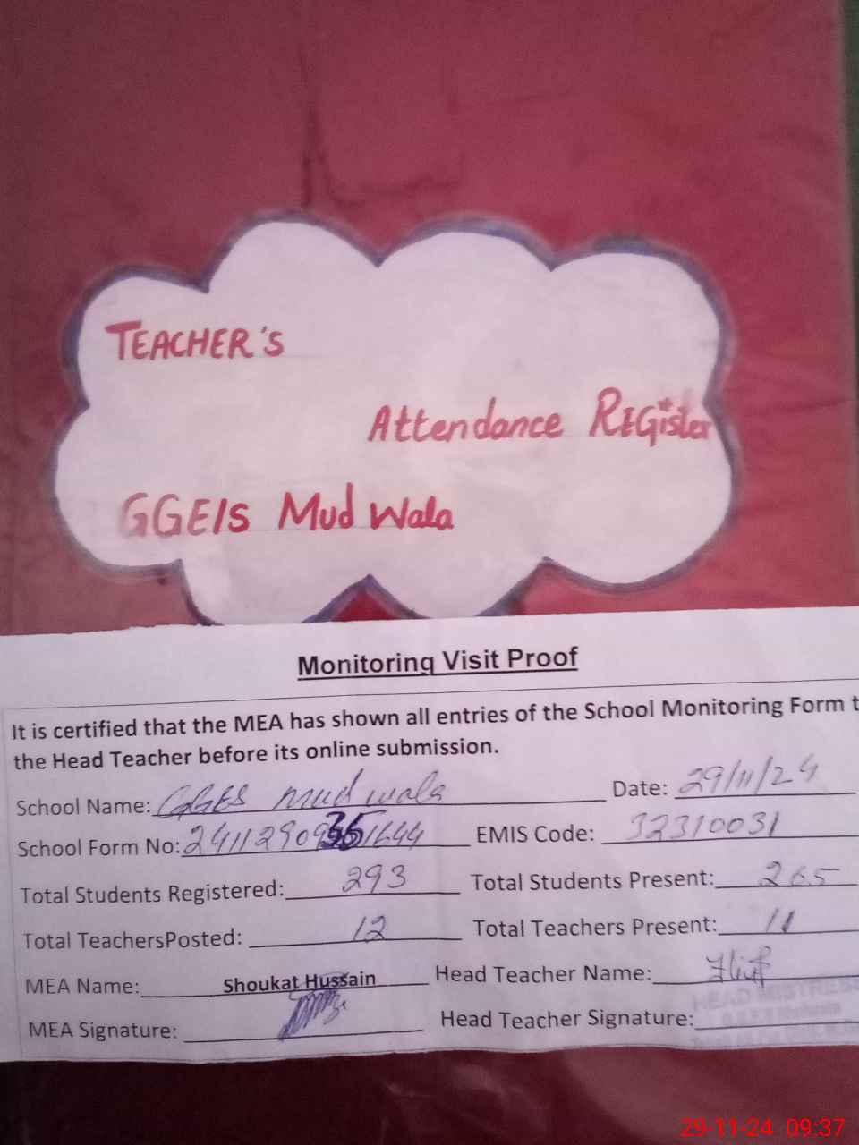 | Attendance Register | Head Teacher | MEA with School | Visit Proof |