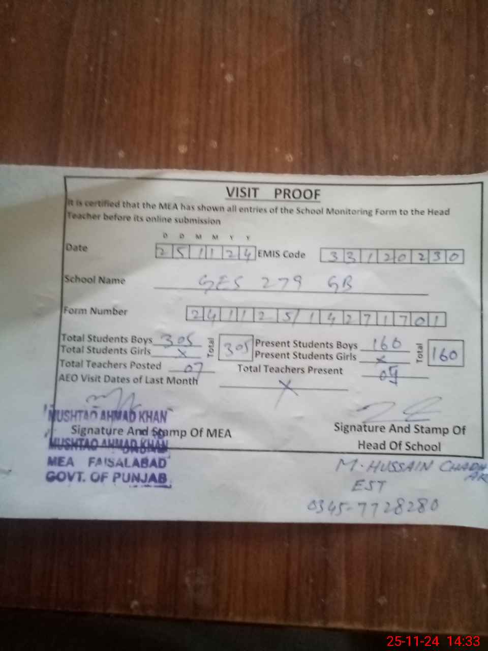 | Attendance Register | Head Teacher | MEA with School | Visit Proof |