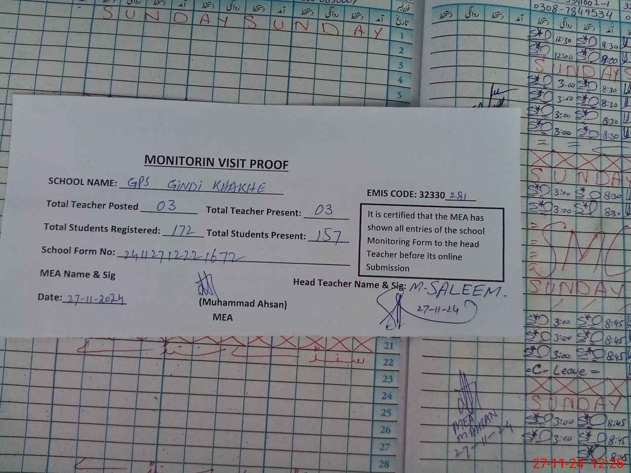 | Attendance Register | Head Teacher | MEA with School | Visit Proof |