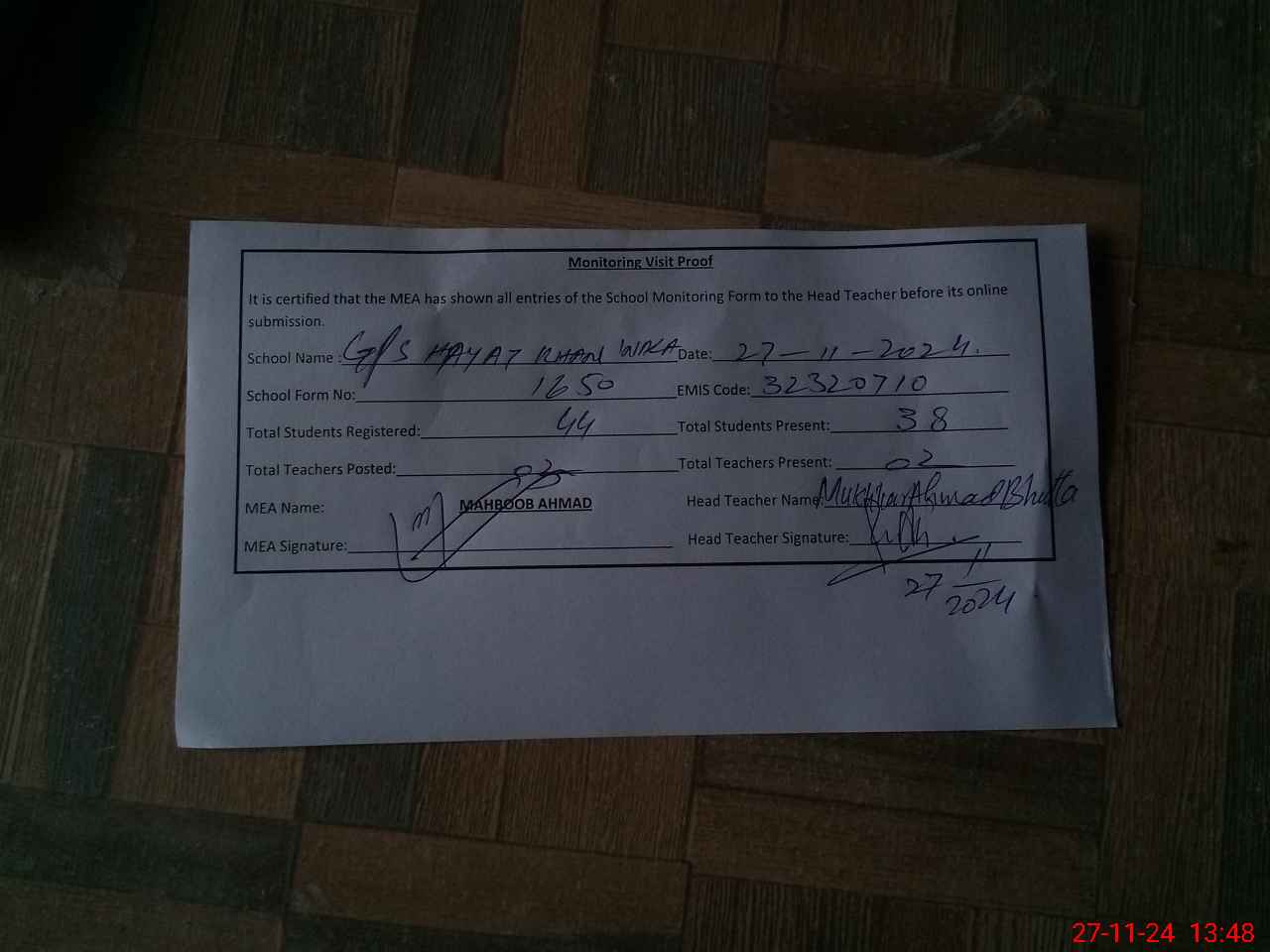 | Attendance Register | Head Teacher | MEA with School | Visit Proof |