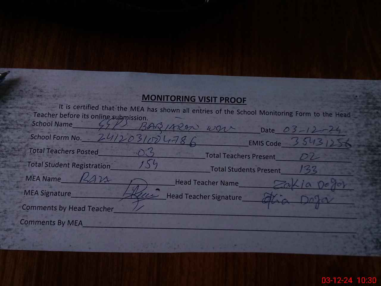 | Attendance Register | Head Teacher | MEA with School | Visit Proof |