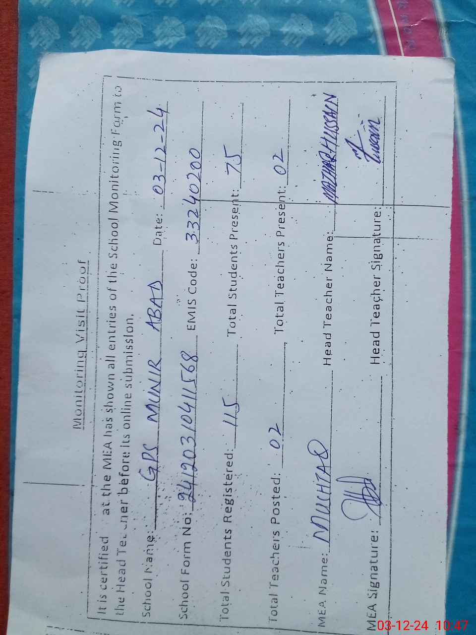 | EMIS Code: 33240200 | Name of School: GPS MUNIR ABAD | |||