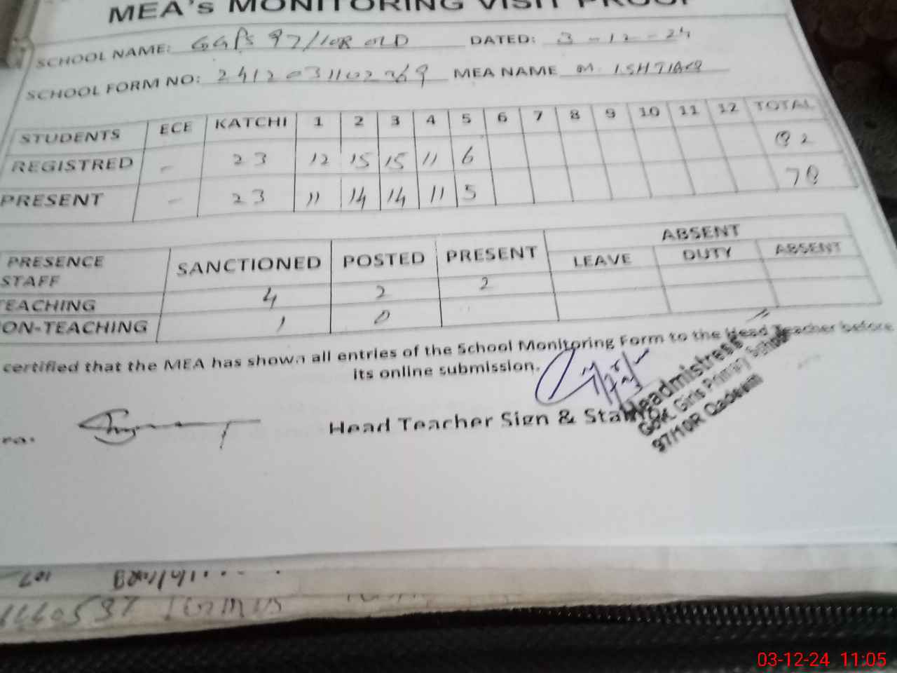| Attendance Register | Head Teacher | MEA with School | Visit Proof |