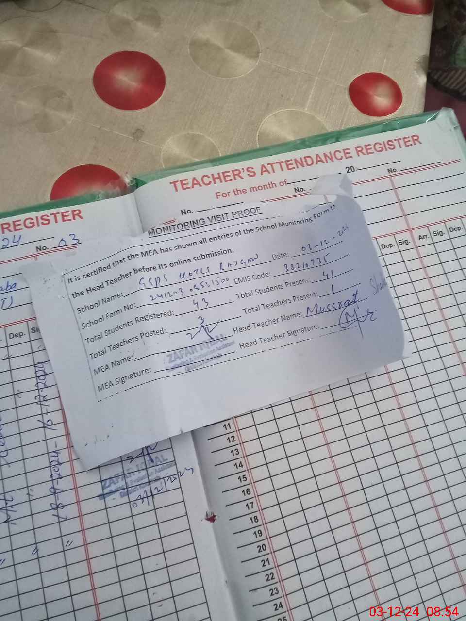 | Attendance Register | Head Teacher | MEA with School | Visit Proof |