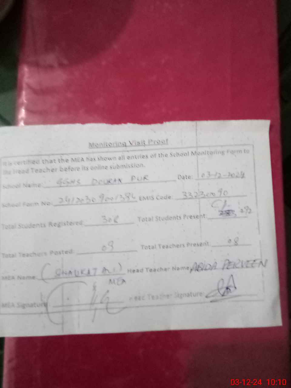 | Attendance Register | Head Teacher | MEA with School | Visit Proof |