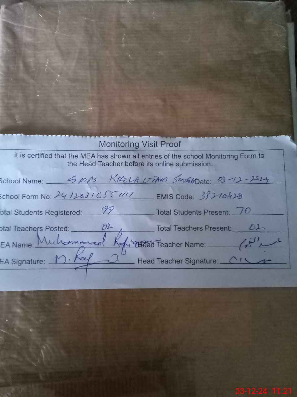 | Attendance Register | Head Teacher | MEA with School | Visit Proof |