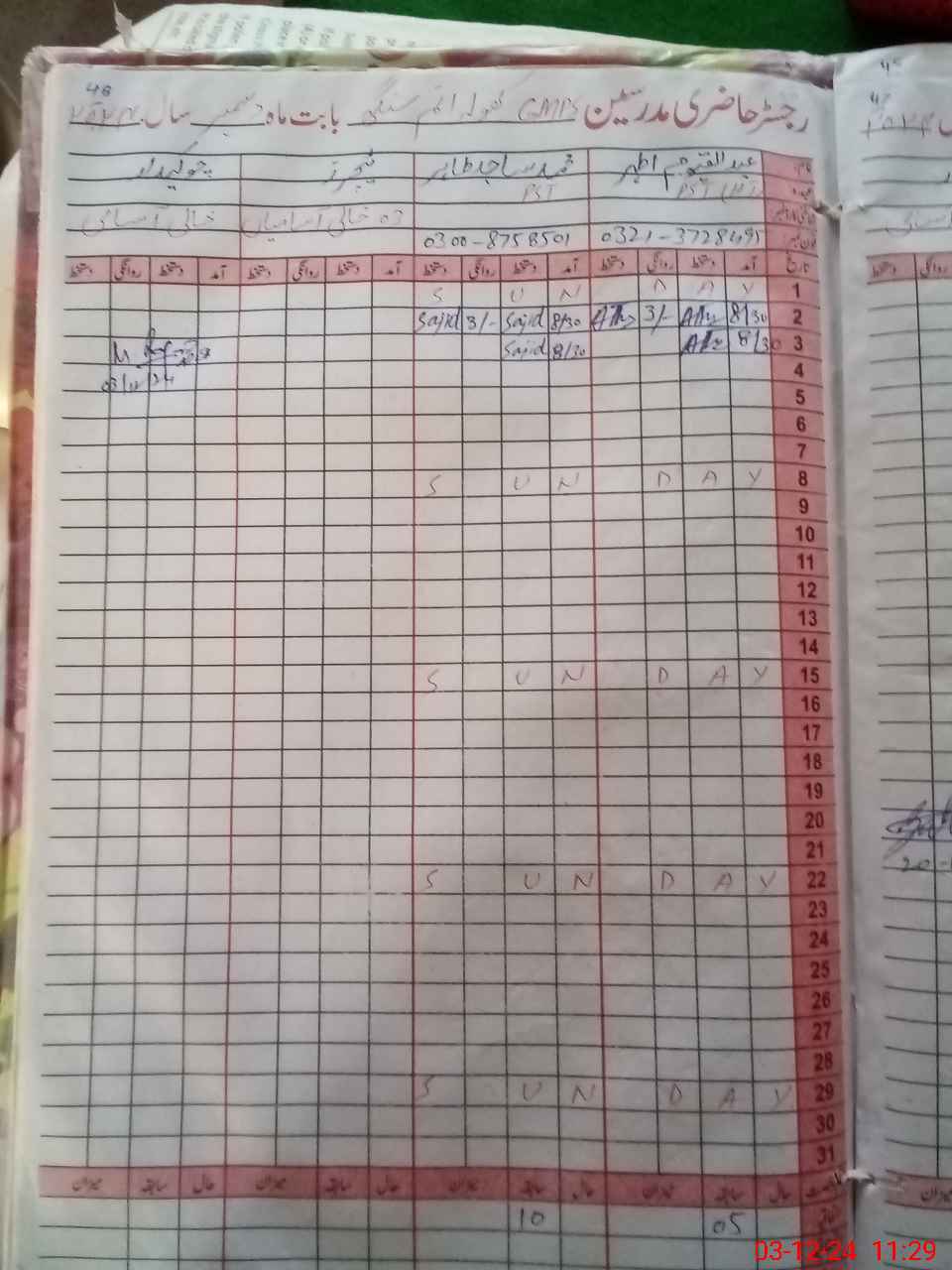 | CNIC | Full Name | Designation | R/C | Absence During Last Calender Month |