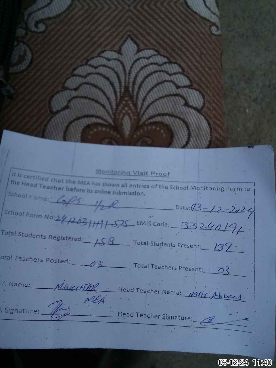| Attendance Register | Head Teacher | MEA with School | Visit Proof |