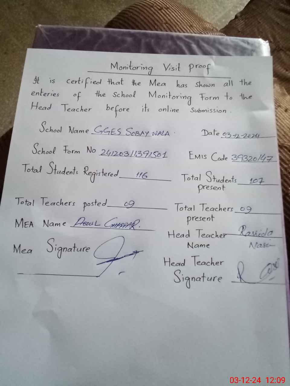 | Attendance Register | Head Teacher | MEA with School | Visit Proof |