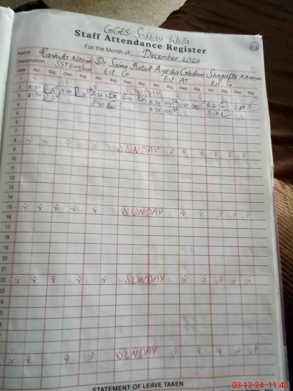 | CNIC | Full Name | Designation | R/C | Absence During Last Calender Month |