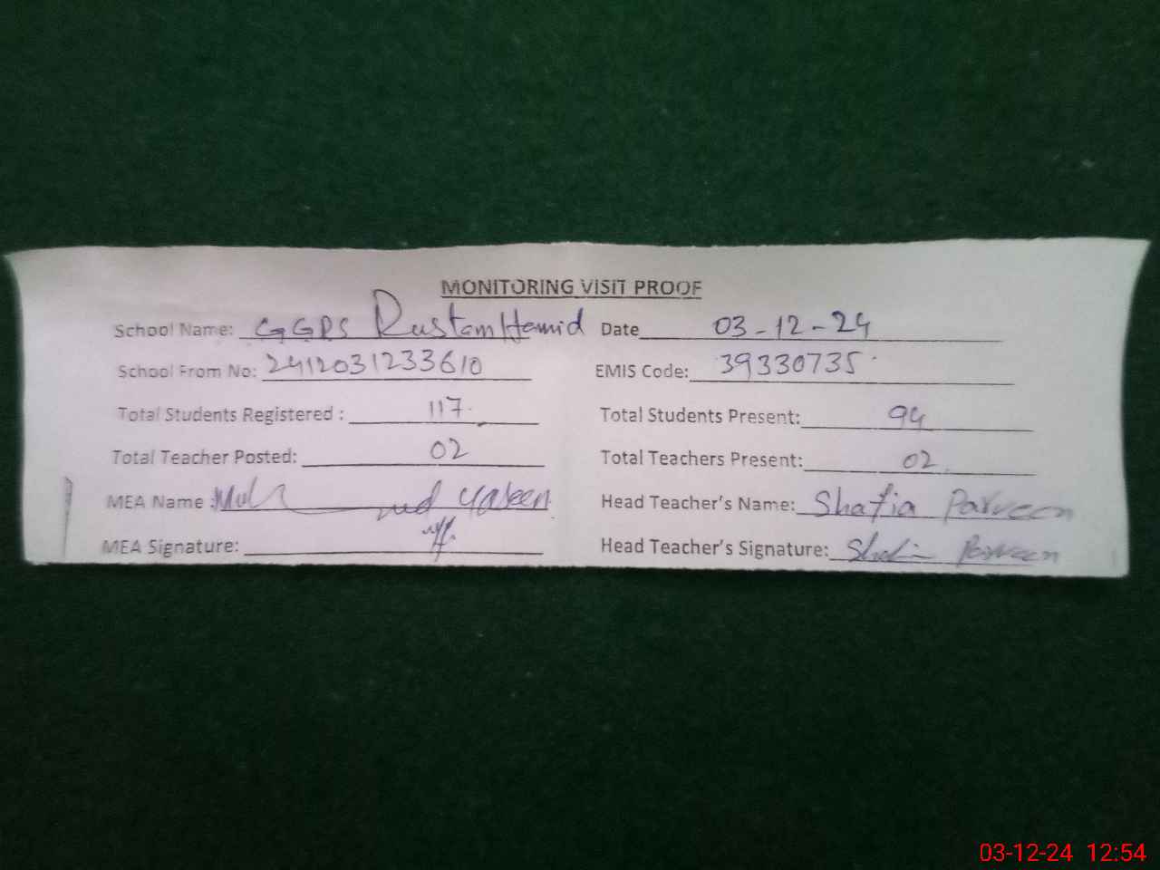| Monitoring Date: 03-12-2024 | Start Time: 03-12-2024 12:33 PM | End Time: 03-12-2024 12:55 PM | Name of MEA: MU**** YA**** | |