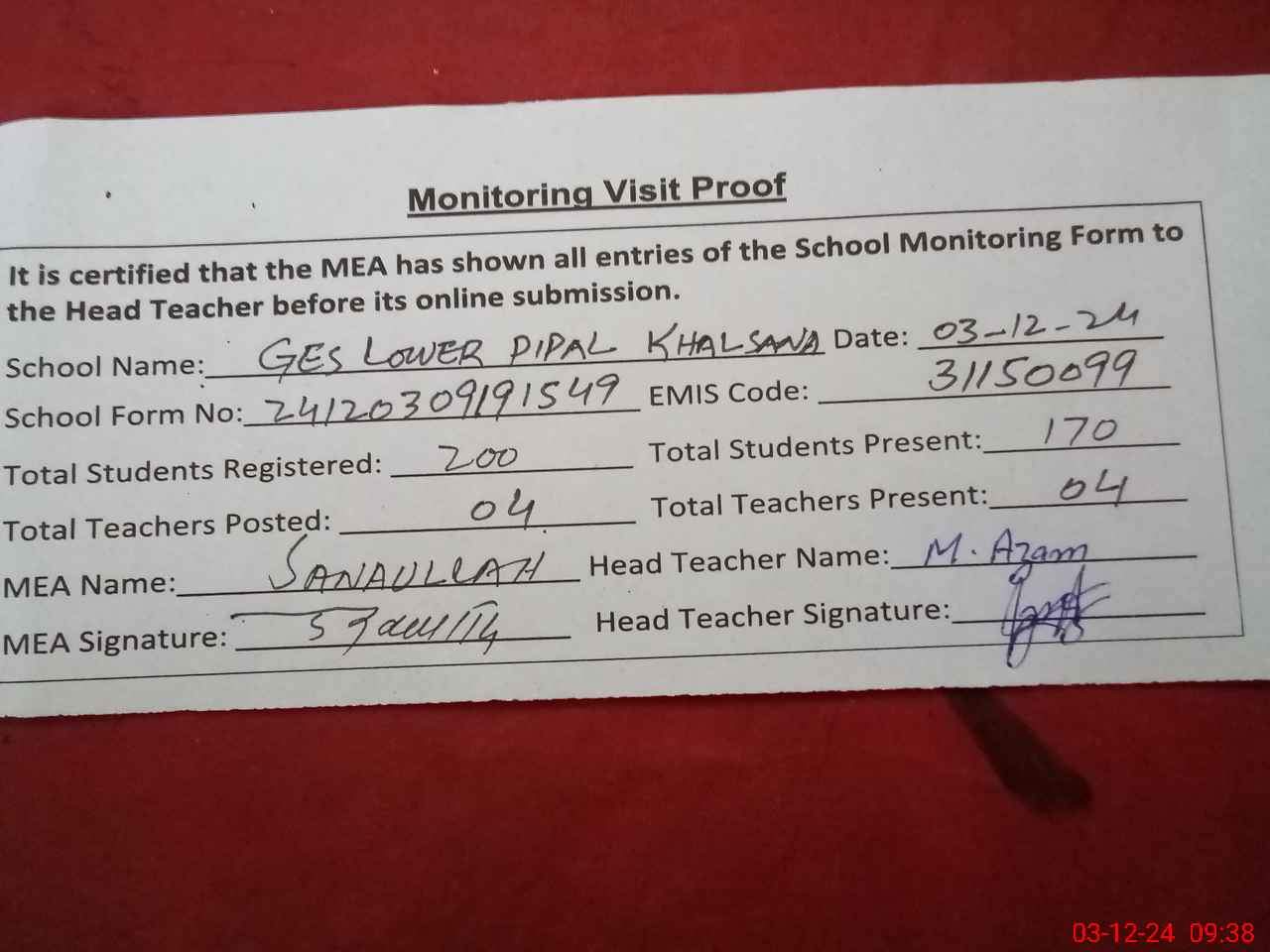 | Attendance Register | Head Teacher | MEA with School | Visit Proof |