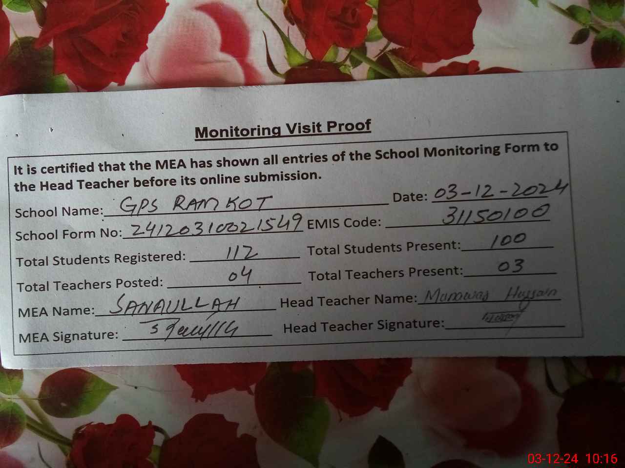 | Attendance Register | Head Teacher | MEA with School | Visit Proof |
