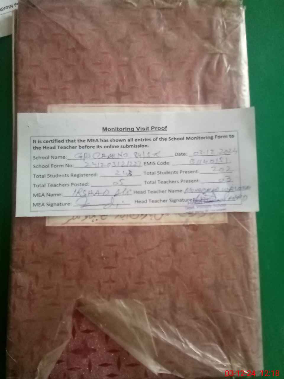 | Attendance Register | Head Teacher | MEA with School | Visit Proof |
