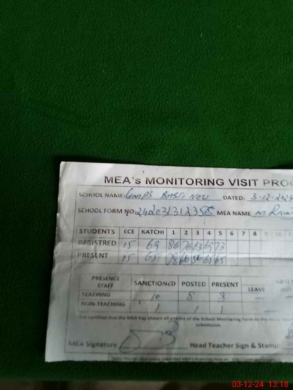 | Attendance Register | Head Teacher | MEA with School | Visit Proof |