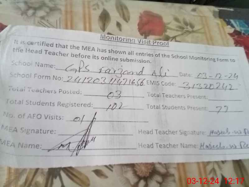 | EMIS Code: 31320242 | Name of School: GPS FARZAND ALI | |||