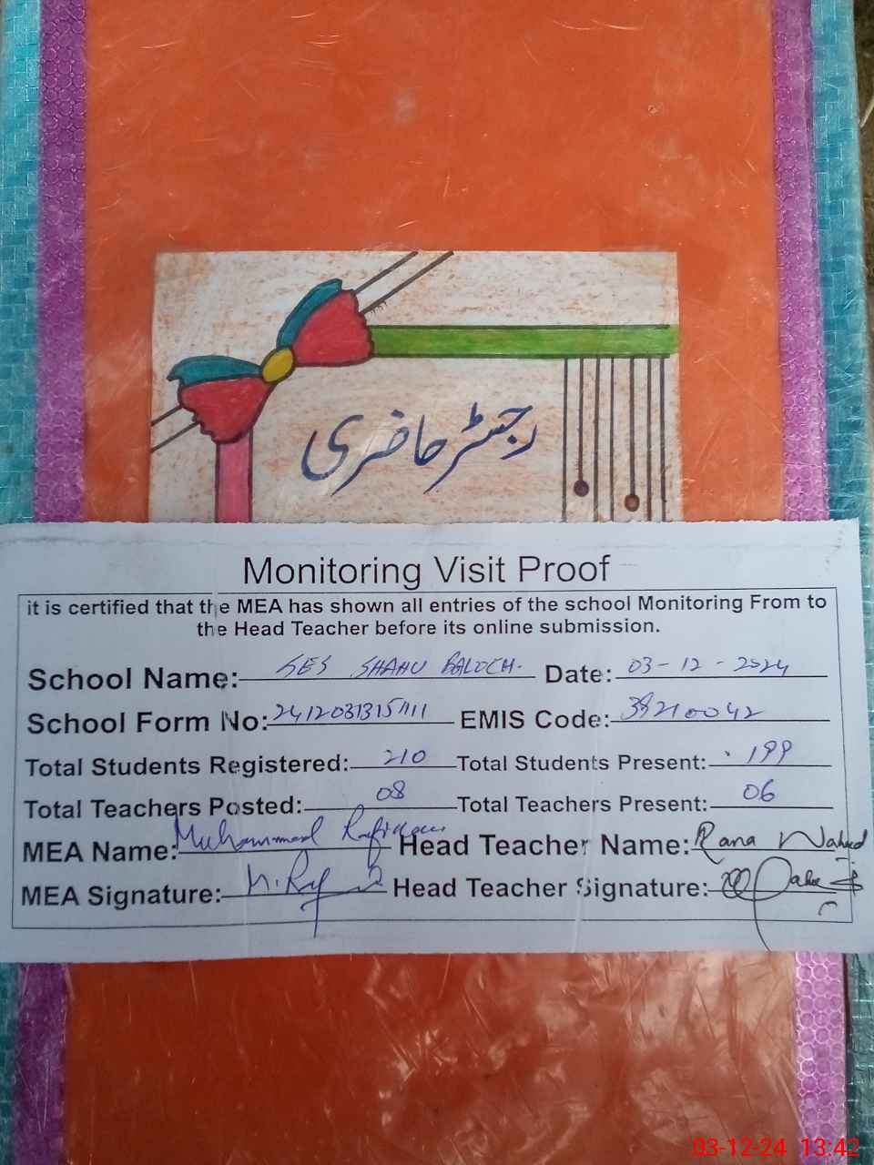 | Attendance Register | Head Teacher | MEA with School | Visit Proof |