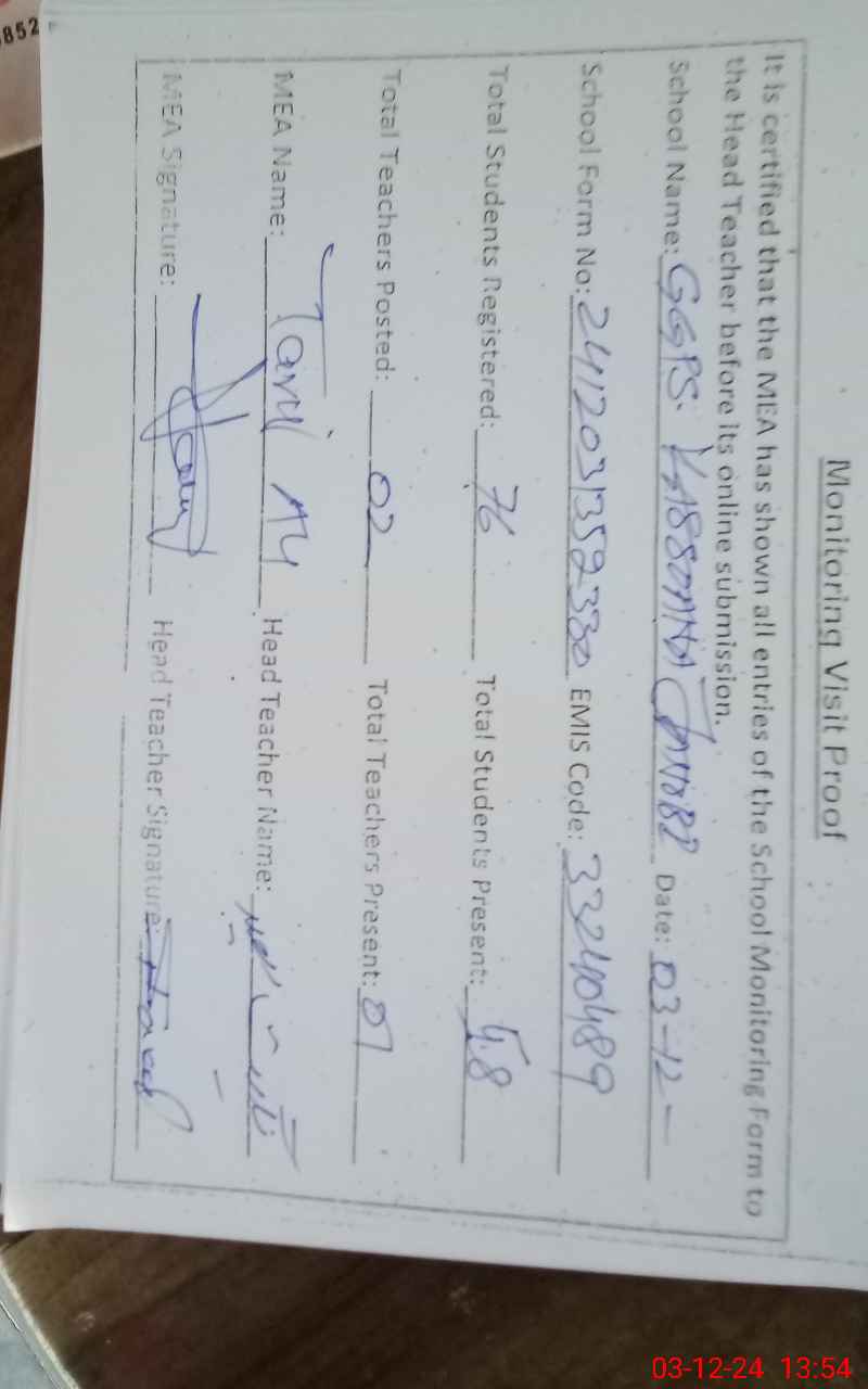 | Certified that this School was Inspected by the Undersigned MEA/DMO Today and the Information Stated Above is as Per Record. | |||||