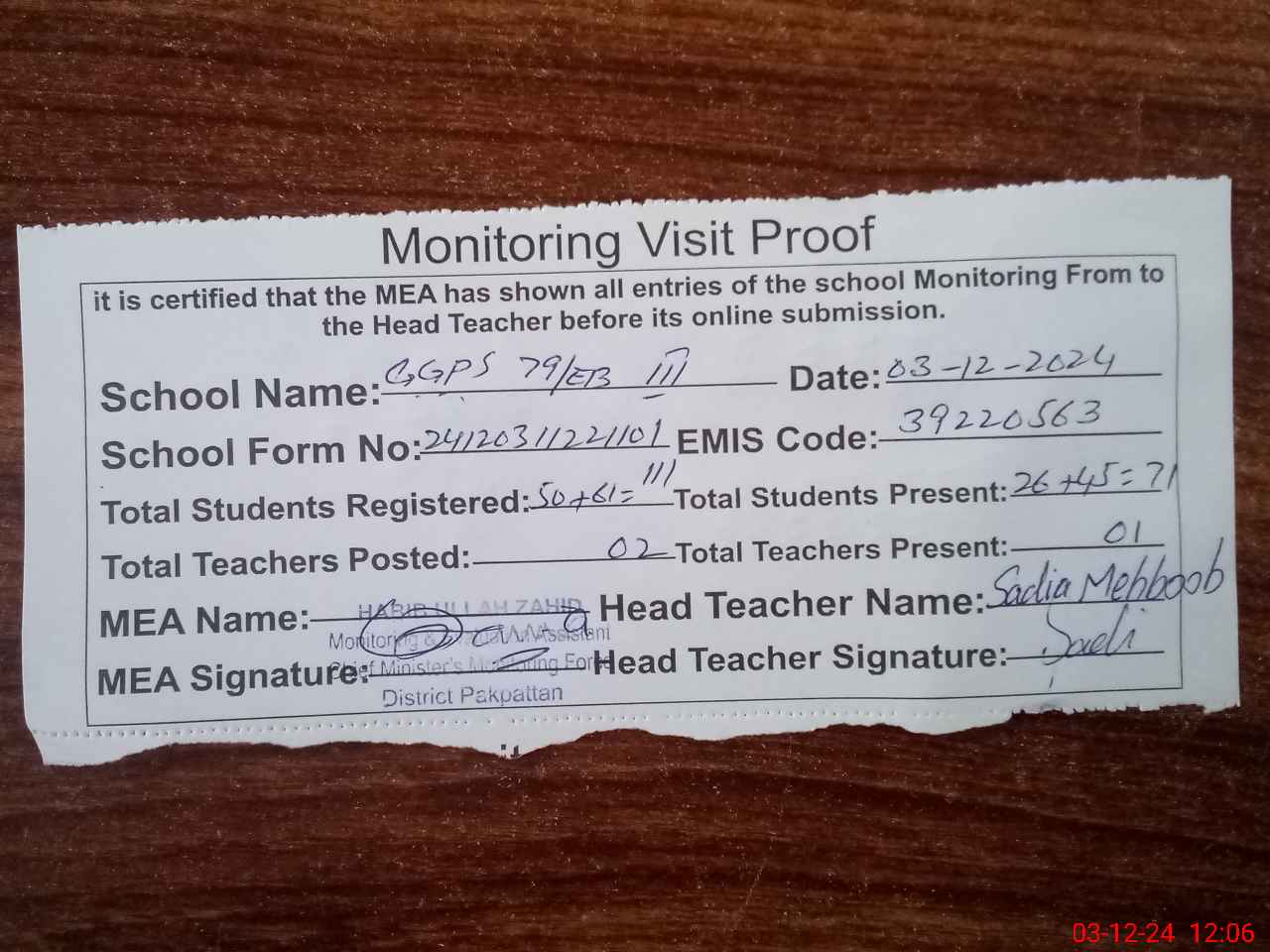 | Attendance Register | Head Teacher | MEA with School | Visit Proof |