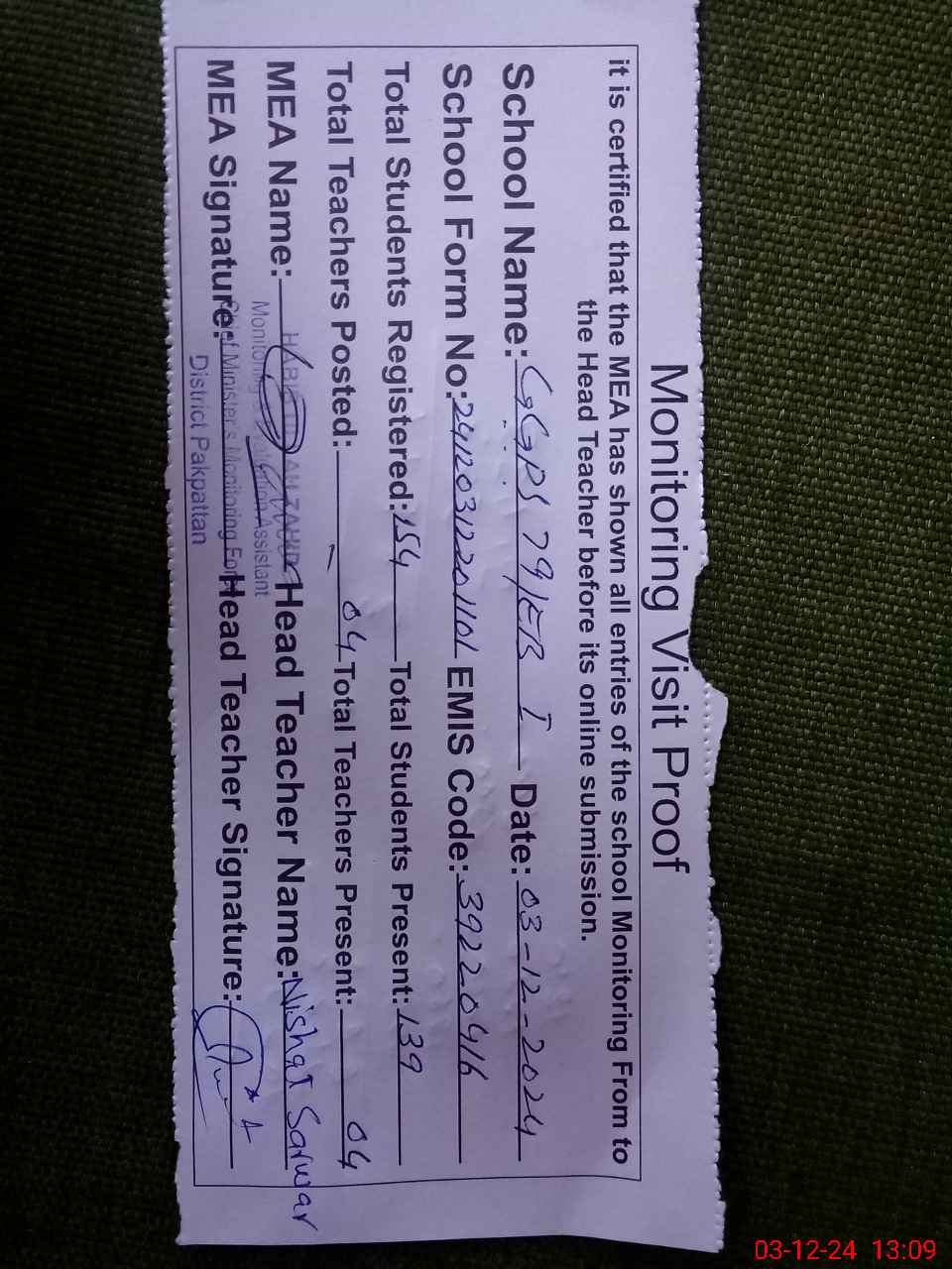 | Name: NI**** SA**** Designation: (School Headmaster's/Headmistress's) PST Phone/Cell Number: 03**** |