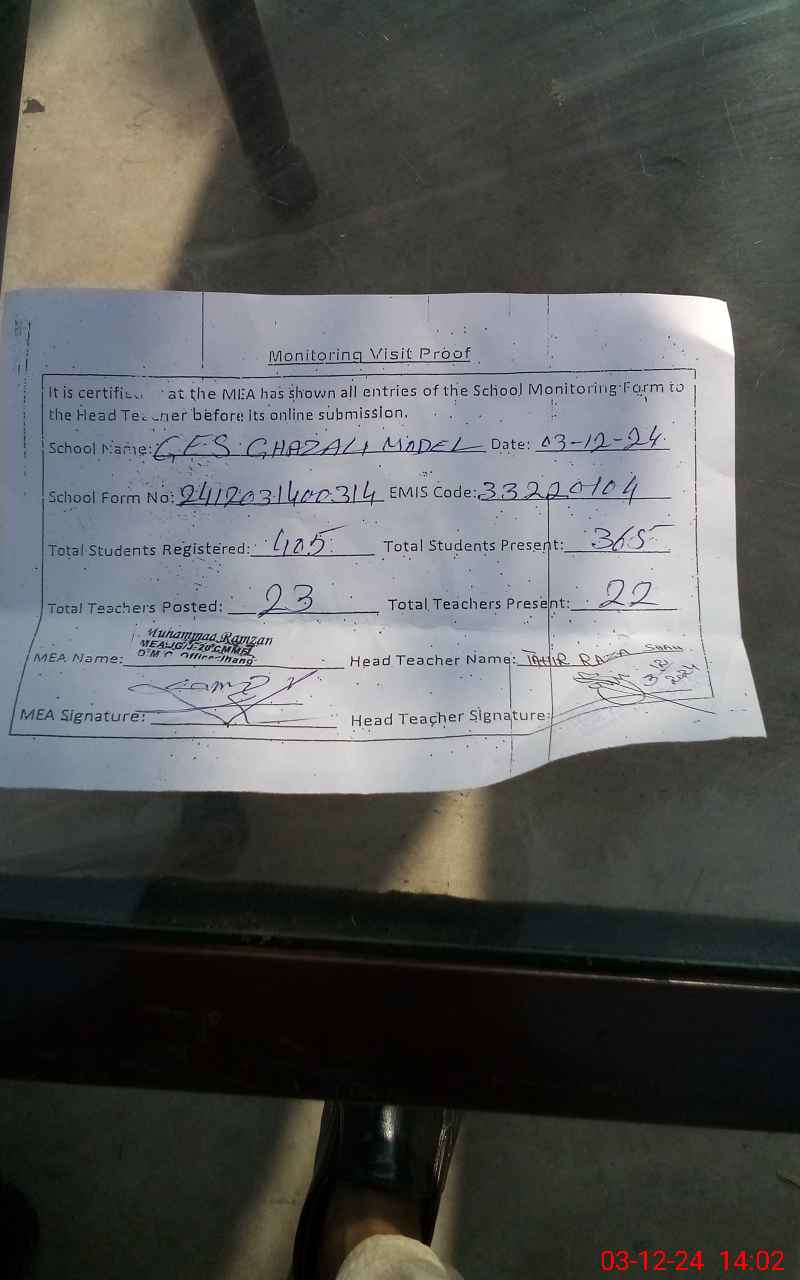 | Attendance Register | Head Teacher | MEA with School | Visit Proof |