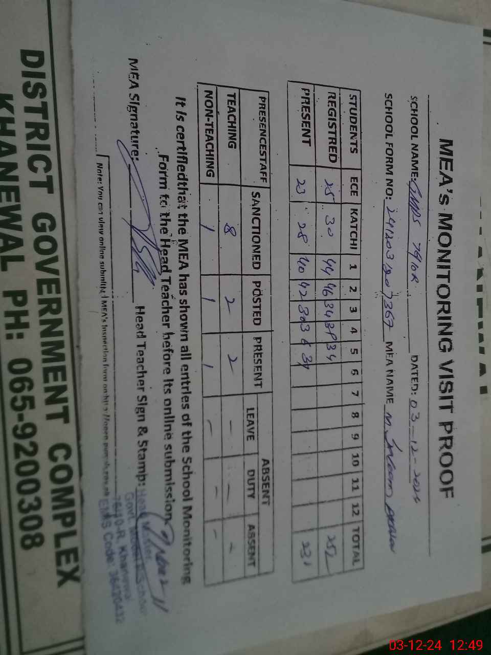 | Attendance Register | Head Teacher | MEA with School | Visit Proof |