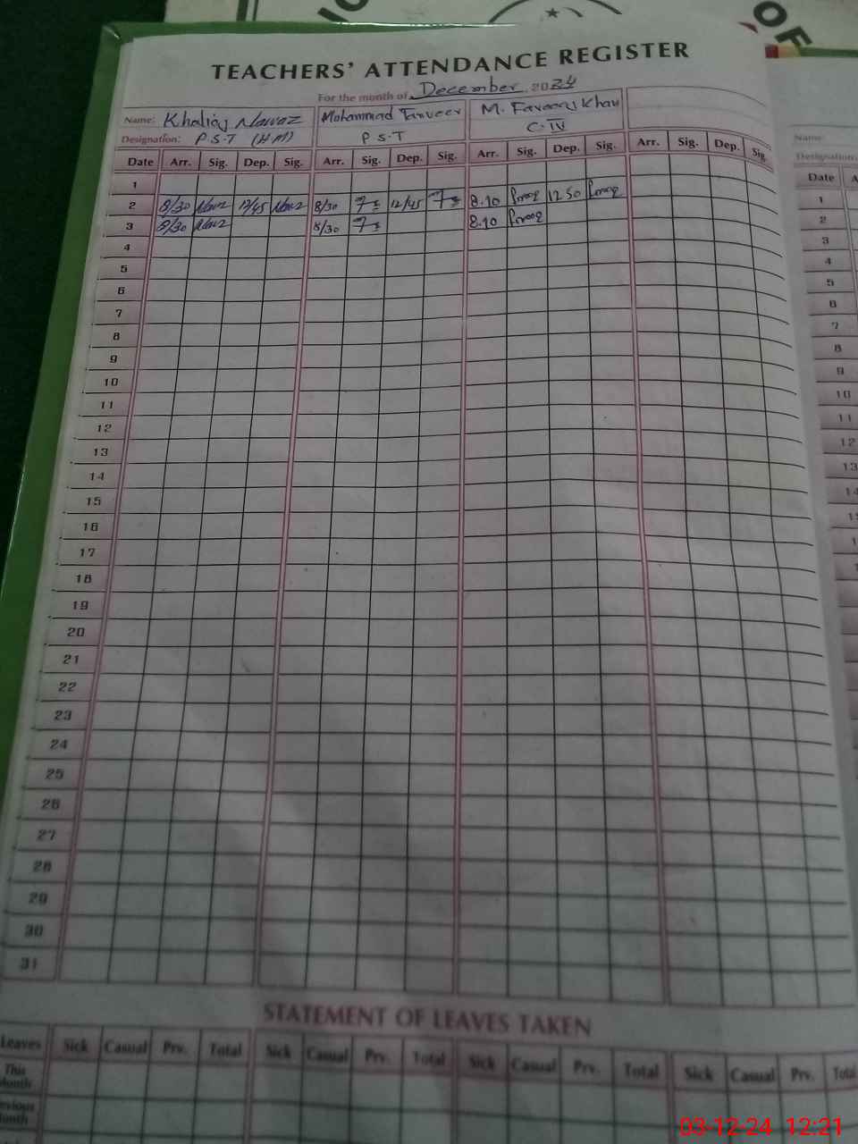 | CNIC | Full Name | Designation | R/C | Absence During Last Calender Month |