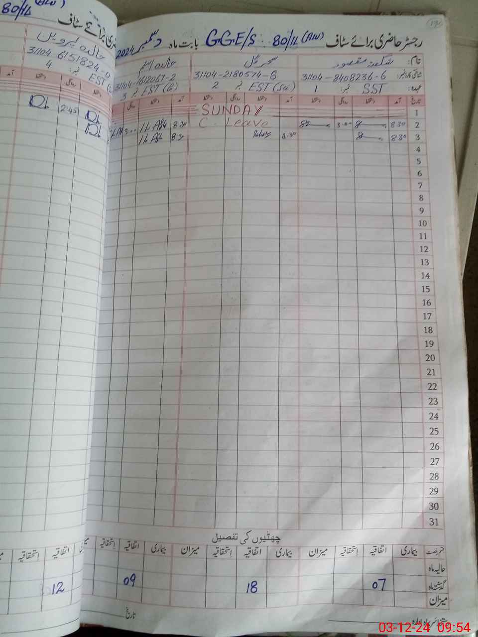 | CNIC | Full Name | Designation | R/C | Absence During Last Calender Month |