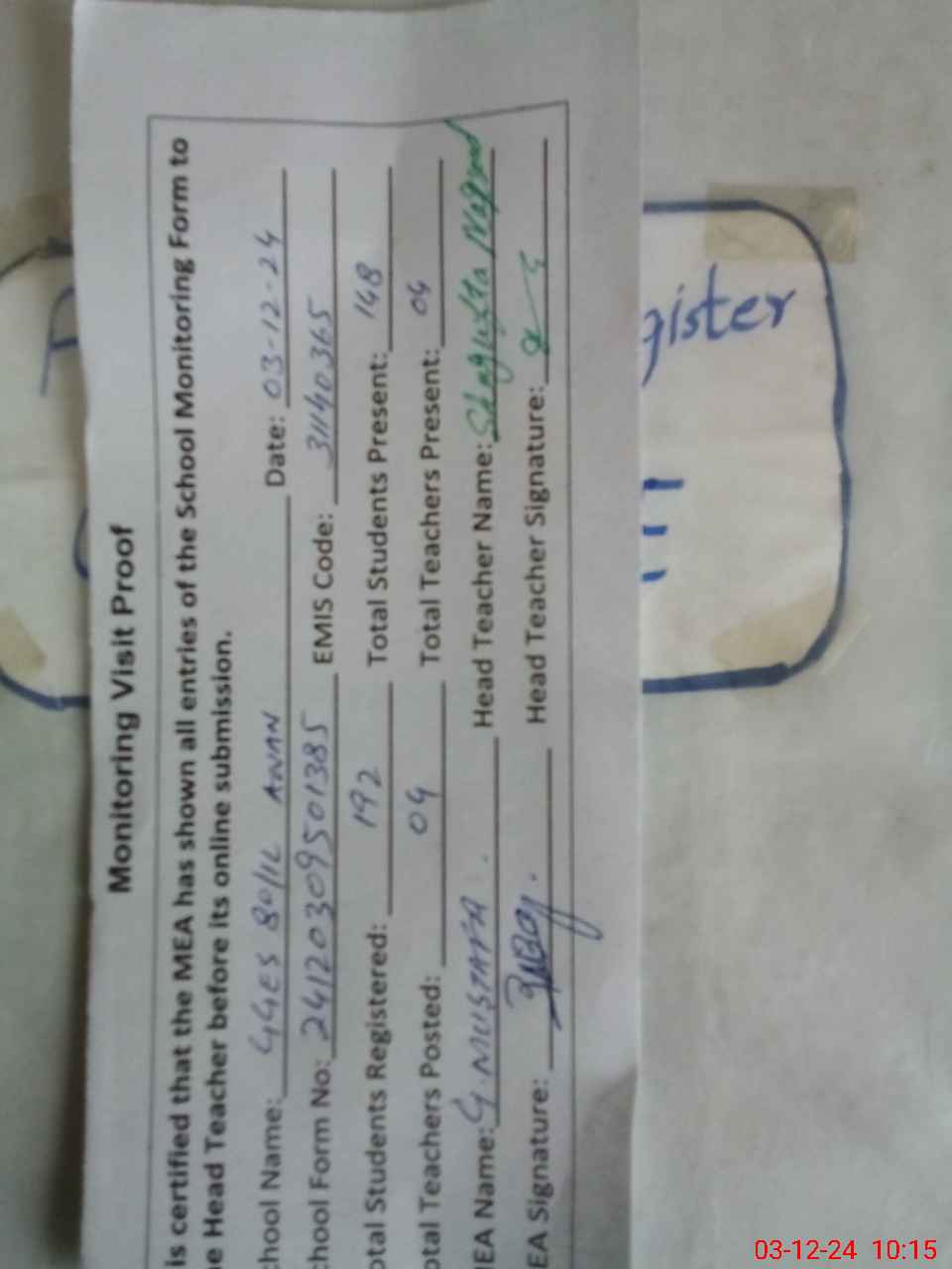 | Attendance Register | Head Teacher | MEA with School | Visit Proof |