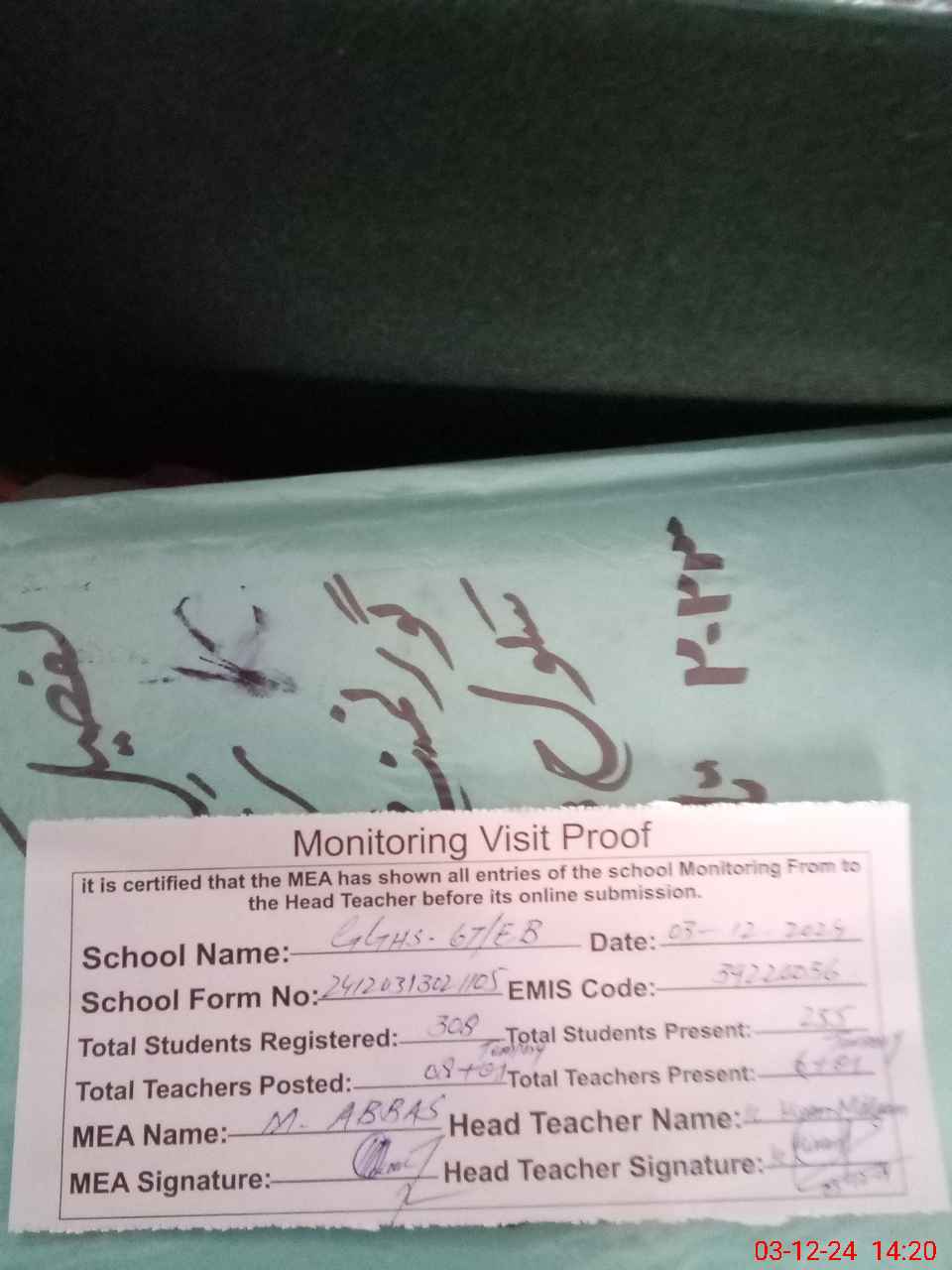 | Attendance Register | Head Teacher | MEA with School | Visit Proof |