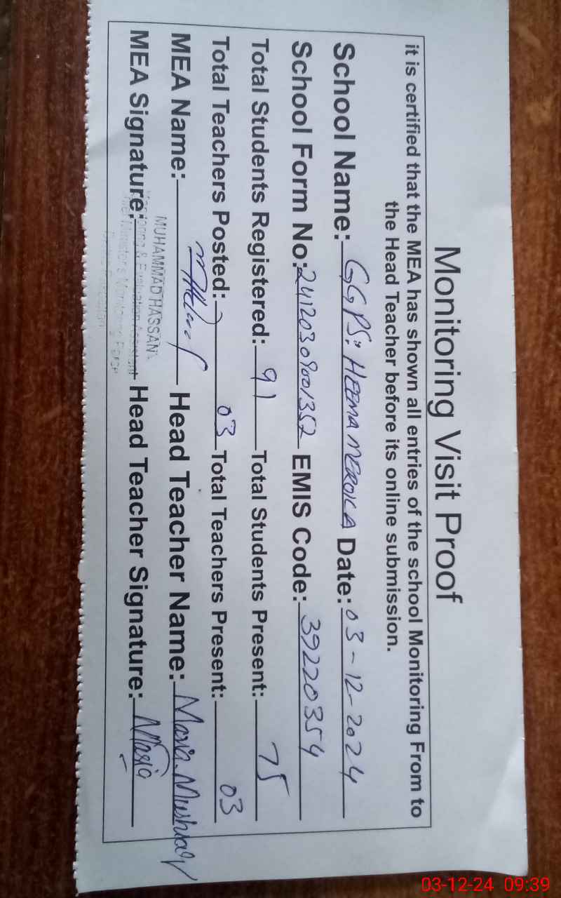 | EMIS Code: 39220354 | Name of School: GGPS HEEMAN MEHROOKA | |||