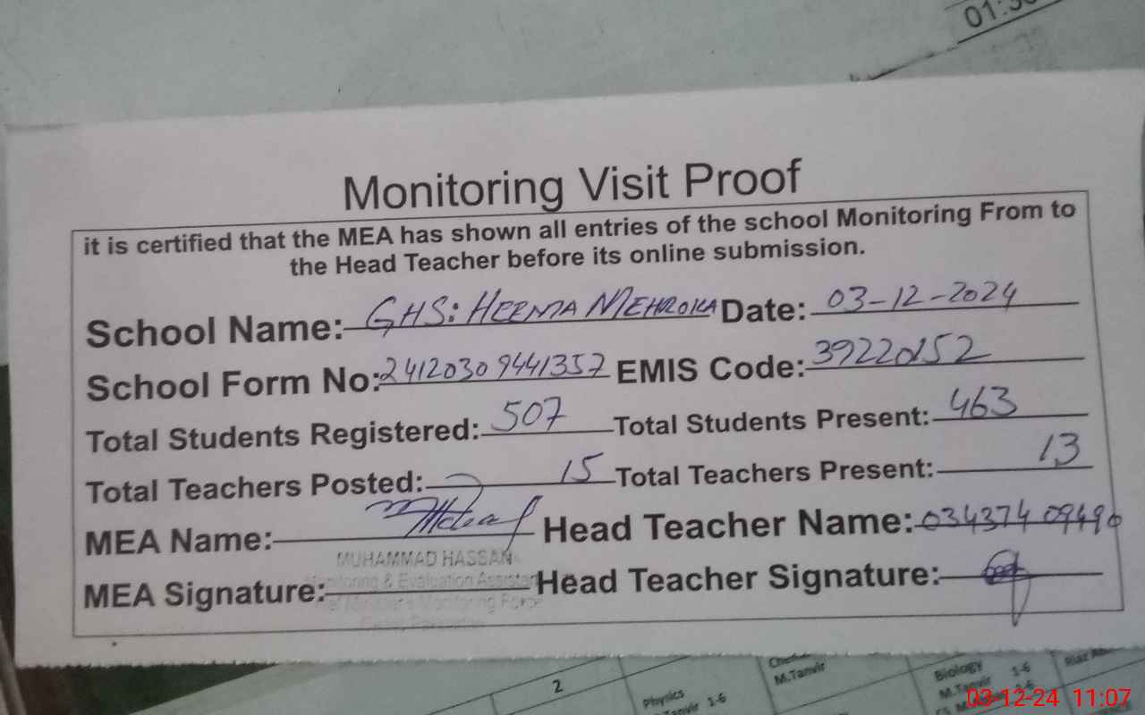 | EMIS Code: 39220152 | Name of School: GHS HEEMA MEHROKA | |||