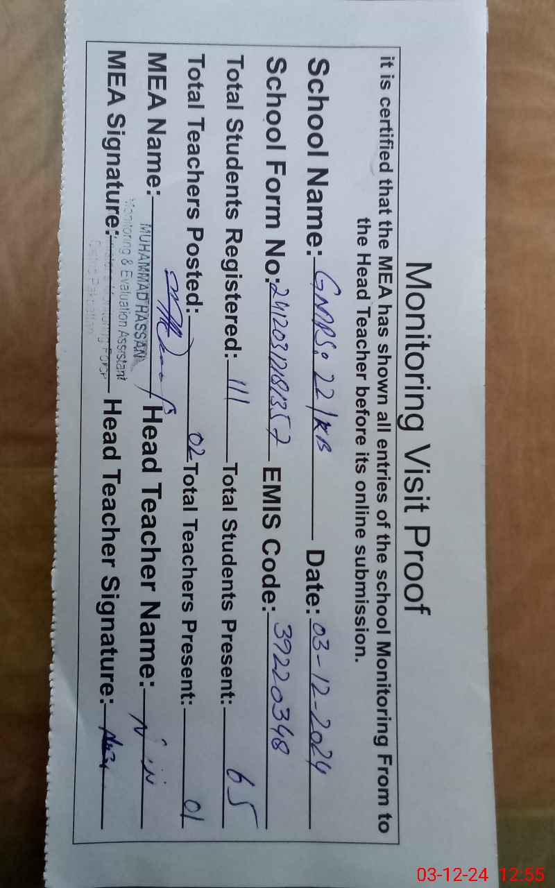 | EMIS Code: 39220348 | Name of School: GMPS 22 KB P/O MACHI SINGHTEH | |||