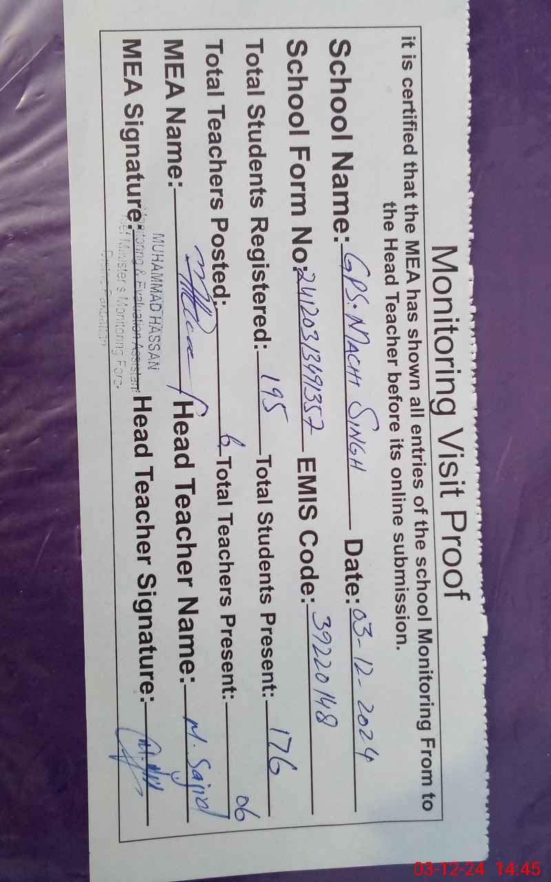 | EMIS Code: 39220148 | Name of School: GPS MACHHI SINGH | |||