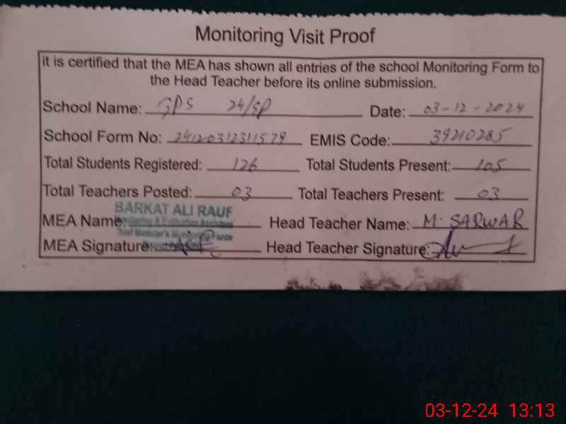 | EMIS Code: 39210285 | Name of School: GPS CHAK NO. 24/SP | |||