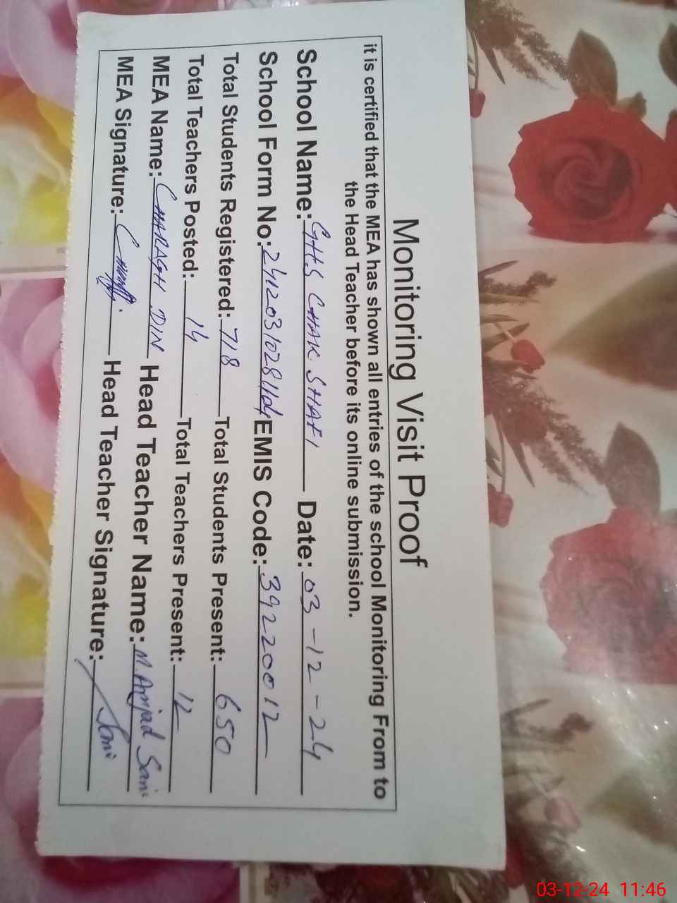 | Attendance Register | Head Teacher | MEA with School | Visit Proof |