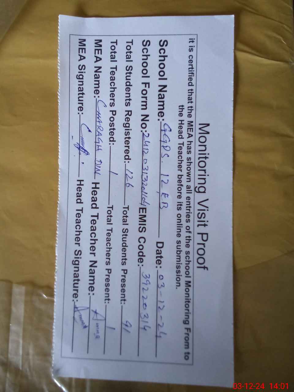| Attendance Register | Head Teacher | MEA with School | Visit Proof |