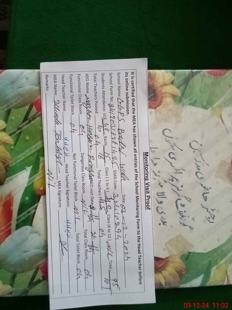 | Certified that this School was Inspected by the Undersigned MEA/DMO Today and the Information Stated Above is as Per Record. | |||||