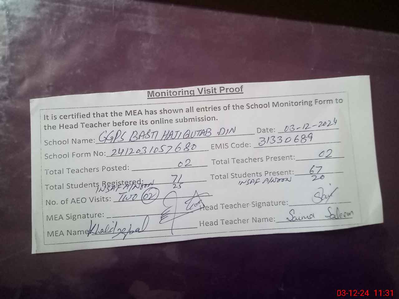 | Remarks (Use Separate Page if Required): Class verification is not updated on mea tab as per sis and NSB record not updated from June 2024 and teachers attendance not updated on sis on 03 12 2024 and school has insaf afternoon classes with students strength 25 | |||||