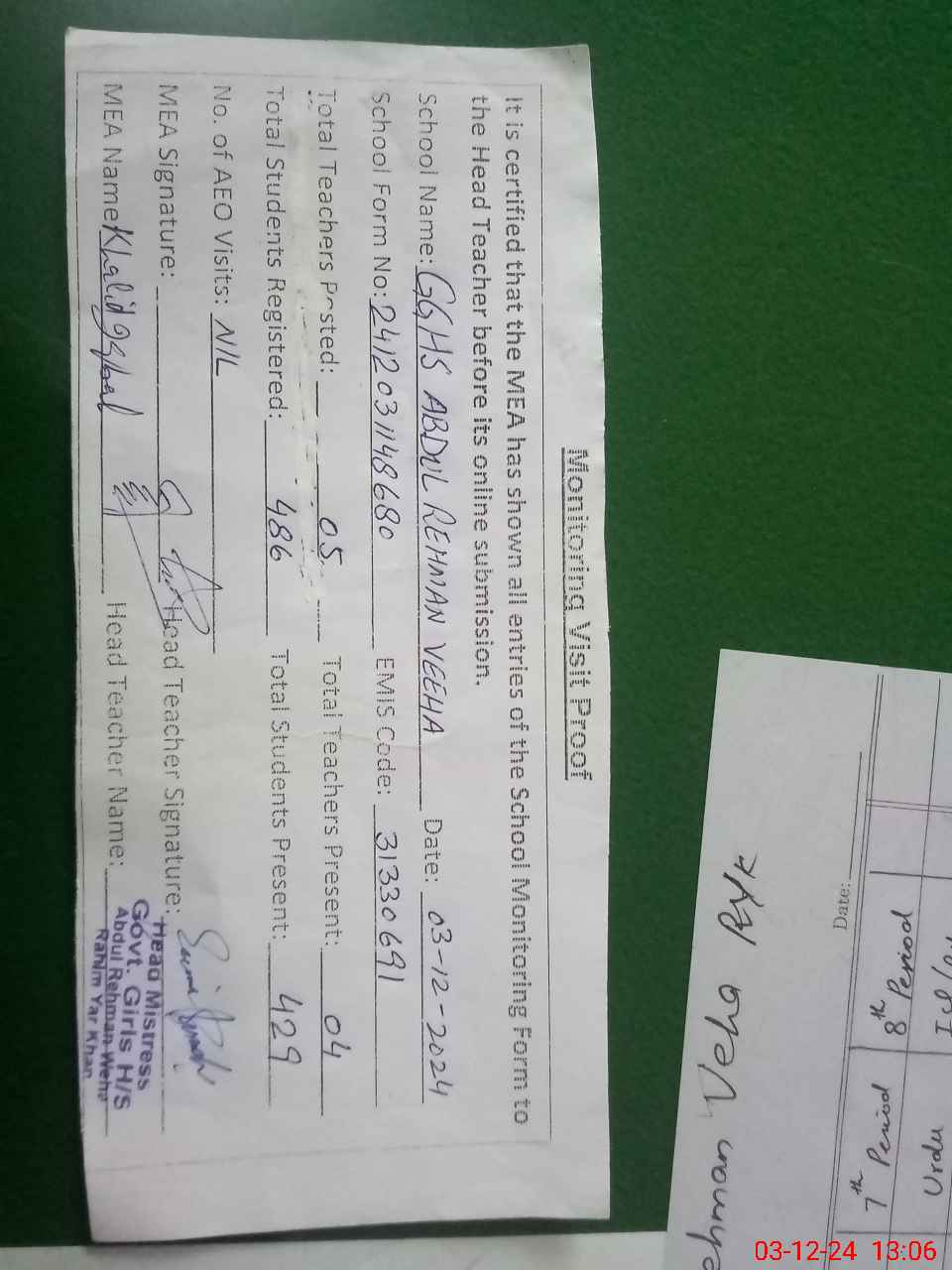 | EMIS Code: 31330691 | Name of School: GGHS ABDUL RAHMAN WEEHA | |||