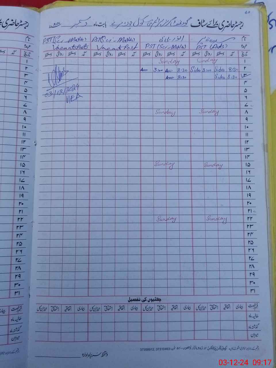 | Name: SI**** NA**** Designation: (School Headmaster's/Headmistress's) PST Phone/Cell Number: 03**** |
