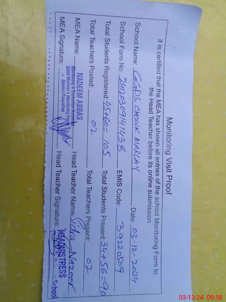 | Attendance Register | Head Teacher | MEA with School | Visit Proof |