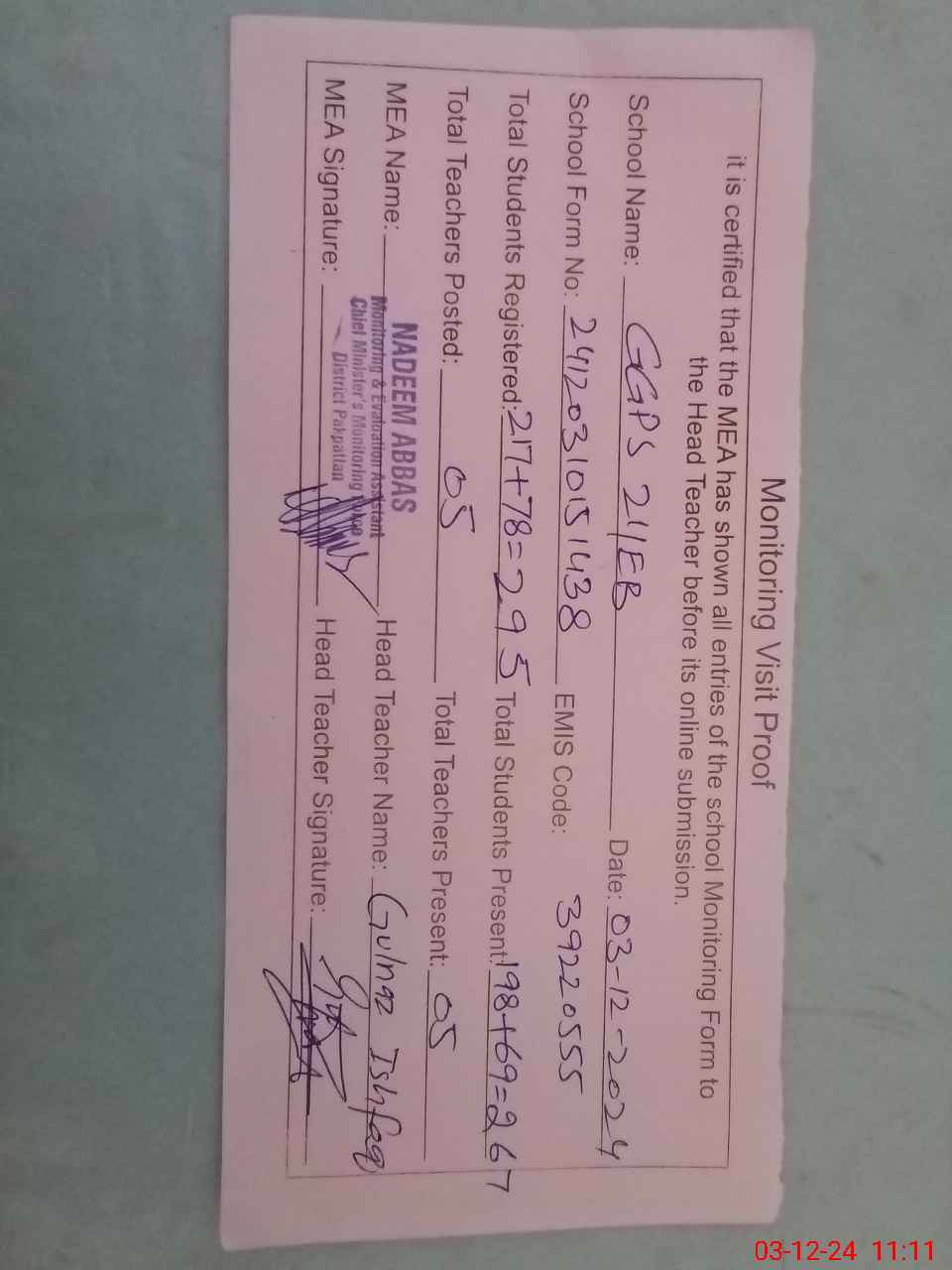 | Certified that this School was Inspected by the Undersigned MEA/DMO Today and the Information Stated Above is as Per Record. | |||||