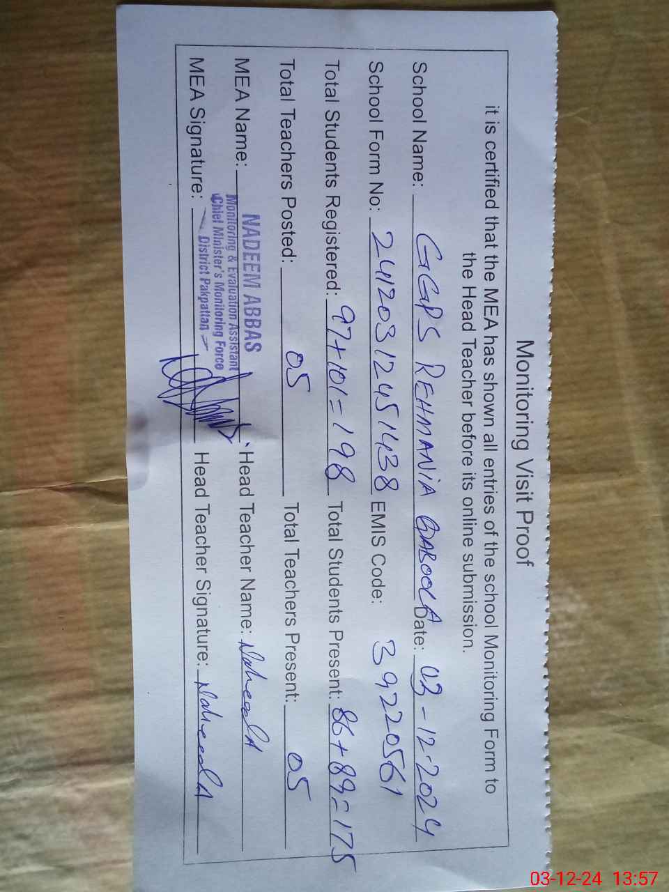 | Attendance Register | Head Teacher | MEA with School | Visit Proof |