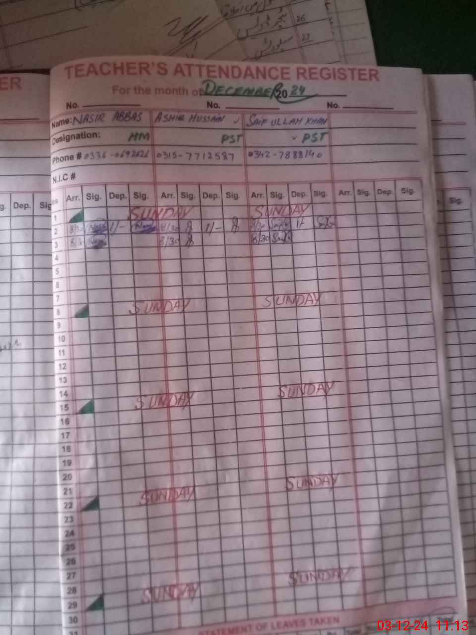 | CNIC | Full Name | Designation | R/C | Absence During Last Calender Month |