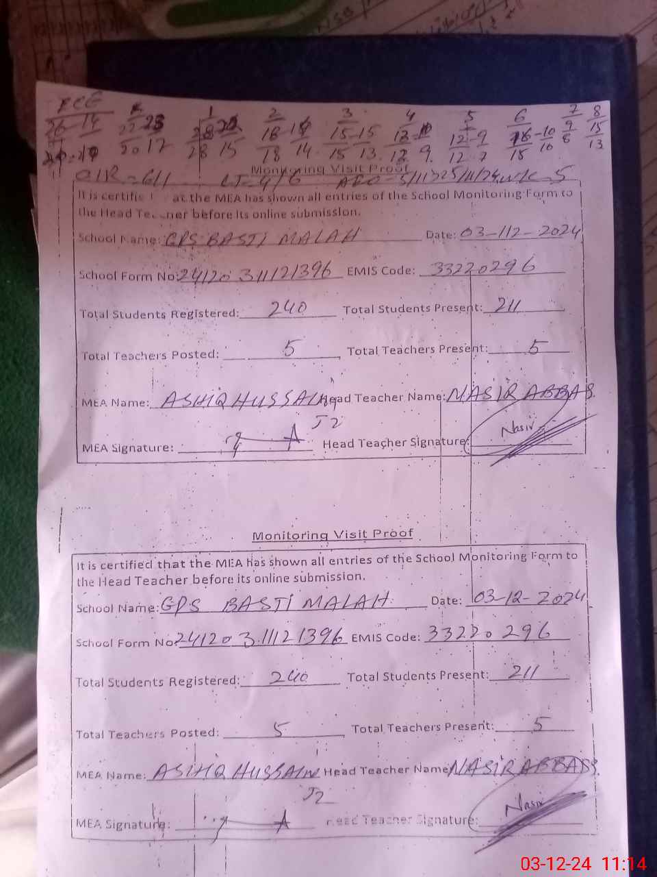 | Attendance Register | Head Teacher | MEA with School | Visit Proof |