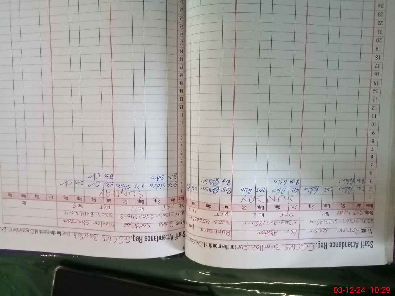| CNIC | Full Name | Designation | R/C | Absence during last cal. month |